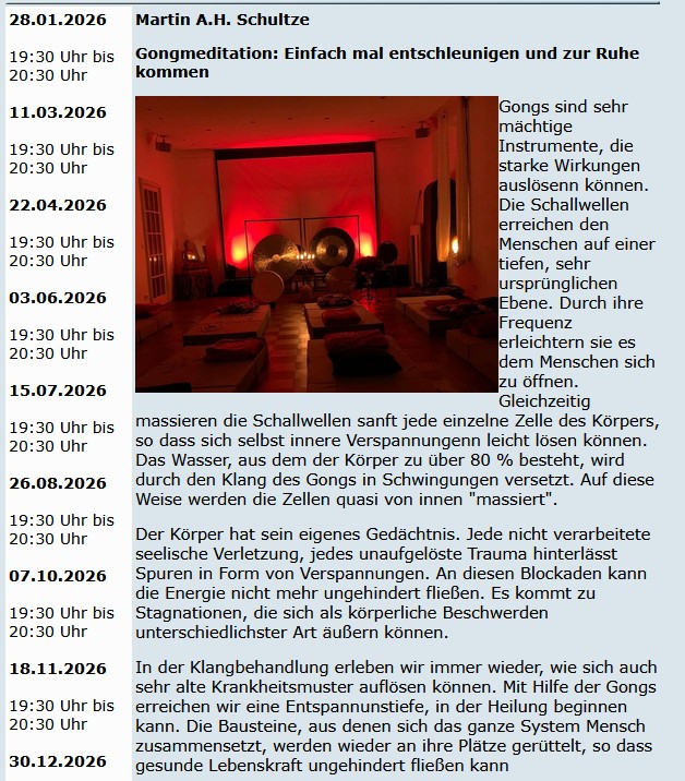 11-teiliger Yoga-Kurs mit Lutz Reichardt ab 14.01.2026 Lutz Reichardt Um Anmeldung wird gebeten! mehr Informationen |